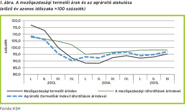 A 2010 és 2012 közötti években a mezőgazdasági termelői árak emelkedése meghaladta a ráfordítási árak emelkedésének mértékét, ami a termelők számára kedvező volt. Ez a tendencia azonban 2013-ban megtört, mert ebben az évben a mezőgazdasági termelői árak 7,8 százalékos csökkenésével szemben a ráfordítási árak 2,1 százalékkal emelkedtek. A termelők árváltozásból következő jövedelemhelyzete 2014-ben és 2015-ben sem javult, mert az előző évi szinthez viszonyítva a mezőgazdasági termelői árak nagyobb mértékben csökkentek, mint a ráfordítási árak.