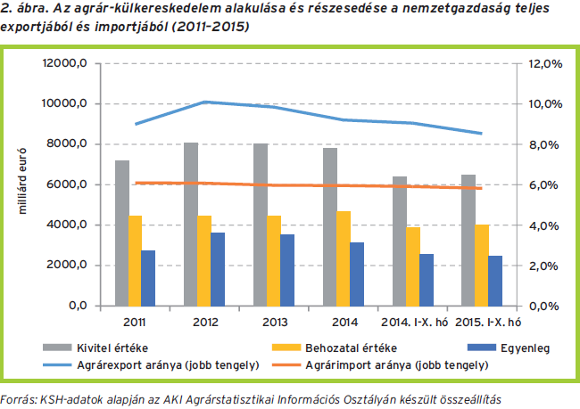 A mezőgazdasági és élelmiszer-ipari termékek kivitelének értéke 2015 első tíz hónapjában mérsékelten (1 százalékkal), míg a behozatalé erősebben (4 százalékkal) emelkedett, így az egyenleg 3 százalékkal elmaradt az egy évvel korábbitól. A mezőgazdasági és élelmiszeripari termékek részesedése a teljes nemzetgazdasági exportból 2015 januárja és októbere között 8,5 százalék, az importból 5,8 százalék volt, 2014 ugyanezen időszakában az agrárexport aránya 9,0 százalékot, az importé 5,9 százalékot ért el (2. ábra).