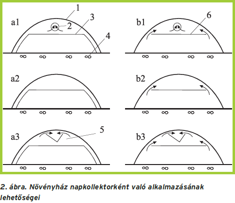 A 2. ábra hengeres alakú fóliás növényházak napkollektorként való üzemeltetésének lehetséges módozatait mutatja be.