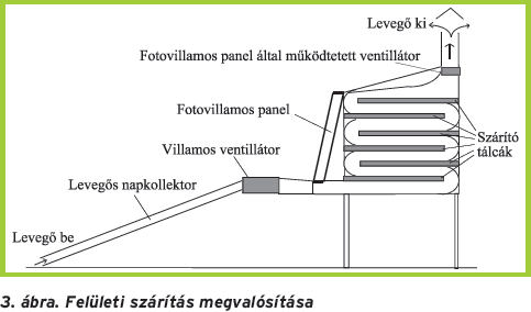 A szárítandó terménytől függően a szárítószekrényben kétféle tálcarendszert lehet alkalmazni, amelyek a szárítószekrénybe cserélhető módon helyezhetők el. Azon termények szárításához, amelyek kis méretüknél fogva tömören helyezkednek el egy adott rétegben, és így a levegő átáramoltatása a terményrétegen nem valósítható meg, felületi szárítás alkalmazható. A tálcarendszer kialakítása ebben az esetben az áramló levegőt a tálcák felett tereli el, így a termény felszíne szárad nagyobb mértékben. Ezt szemlélteti a 3. ábra.