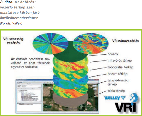 A térkép alapján és az öntözőberendezéssel lefedett területen termesztett növények elhelyezkedését figyelembe véve lehet dönteni az öntözésvezérlés módjáról. Homogén növényállomány és nem túl nagy területi ingadozások esetén elegendő lehet a sebességvezérlés, ellenkező esetben a zónavezérlés jöhet szóba (2. ábra).