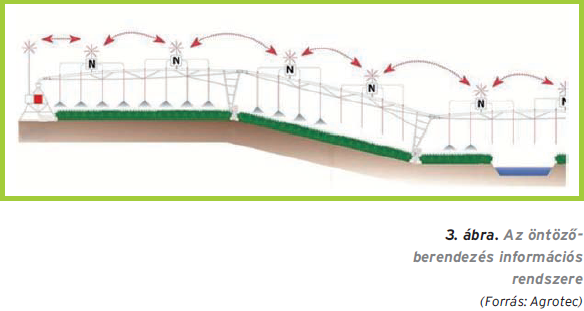 A 3. ábrán bemutatott példa szerint a rendszer a szórófejeket négyesével csoportosítja és egy ún. nóduszhoz (N) rendeli. Így összeáll egy kommunikációs lánc, amely folyamatos adatforgalmat biztosít az öntözőberendezés és a központi tornyon elhelyezett vezérlőegység között. A központi egység nemcsak kiküldi az információt, de visszacsatolást is kap a szórófejek működéséről, vagyis működik egy önellenőrző funkció is.