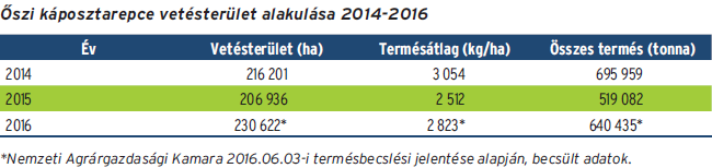 A május közepén megjelent AKI-jelentésben (Agrárgazdasági Kutató Intézet) arról számoltak be, hogy repcemagból és repceolajból együttesen 66 millió tonnát, az egy évvel korábbitól 1–2 millió tonnával elmaradó mennyiséget takaríthatnak be a világon a 2016/2017. évi szezonban (USDA, Tallage). Az első számú termelőnél, az Európai Unióban 6,3–6,4 millió hektárról 21,5–22 millió tonna repcemag kerülhet a tárolókba az idén. A nyugat-európai tagállamokban, valamint Lengyelországban kielégítő állapotban vannak a repceállományok, jóllehet az áprilisi lehűlés hatása egyelőre nem látszik. Ugyanakkor az enyhe téli időjárás miatt az idén a kórokozók fokozott jelenlétére lehet számítani, ami további kockázatot jelent a 2016. évi termést illetően. Ezzel szemben a közép- és délkelet-európai tagországokban kitűnő kondícióban van a növényzet, biztatóak a kilátások.