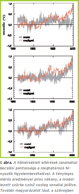 A felsorolt három hatótényezőből az első kettő a napjainkban bekövetkező változások mélyebb megértését segíti elő, míg az antropogén körülmények azok, amelyekre hatással vagyunk, amely a másik két csoporthoz képest gyors reakcióidejű. A három tényező hatásának pontos aránya mind a mai napig kevésbé tisztázott, gyakran képezi kutatók élénk eszmecseréjének tárgyát. Az 1. ábránk a csak a természetes hatásokat (felső részábra), az ember módosításait (középső rész) és mindkettő együttes figyelembevételének (alsó rész) eredményességét mutatja a modellezések során (IPCC Helyzetértékelő Jelentése alapján).