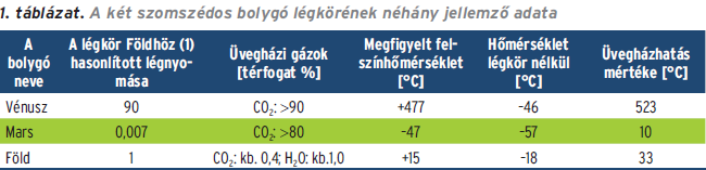 A Földünket körülölelő légkör sajátos összetételű; sok a nitrogén, N2 (78 térfogat %), s elég sok még a két-atomos oxigén molekula, az O2 is (közel 21 térfogat %). Ezen fő alkotók mellett azonban számtalan egyéb gázt, szilárd és cseppfolyós halmazállapotú komponenseket is tartalmaz légkörünk, amelyek közül néhány sajátos energia-visszatartó tulajdonsággal rendelkezik. Ha csak a N2 és az O2 lenne a légkörben, a Föld légkörének talaj közeli rétegében az évi középhőmérséklet –18 °C lenne. Ha megmérjük a tényleges hőmérsékletet, azt találjuk, hogy az több, mint 30 fokkal melegebb, mint a két gázra korlátozott összetételű légkörben tapasztalható lenne; jelenleg 15 °C. Összehasonlításképpen álljon itt a két szomszédos bolygó (Vénusz és Mars) légköre, melyek tulajdonságai jelentősen eltérnek a Földétől, s ennek megfelelően felszínhőmérsékletük is másképpen alakul (1. táblázat).