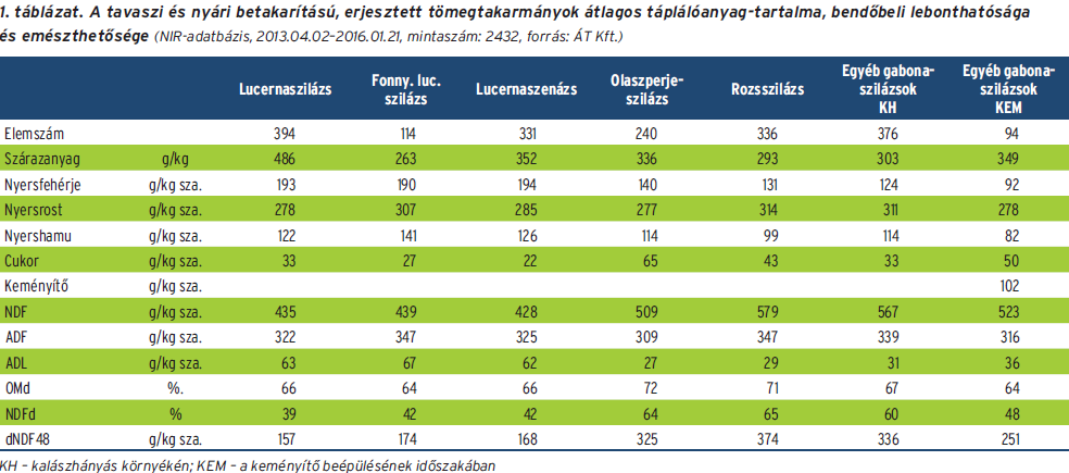 Az 1. táblázatban üzemi szilázsaink táplálóanyag-tartalma látható a 2013–2015 folyamán. Összehasonlítható a rozs és a korai betakarítású gabonafélék táplálóanyag-tartalma az egyéb hazai szilázsokkal. Kérjük, vegyék figyelembe, hogy az alábbi táblázatban közölt adatok csak azt mutatják meg, hogy milyen minőségi paraméterekkel bírtak fontosabb tömegtakarmányaink 2013–2015 között, nem pedig azt, hogy milyen az ideális tömegtakarmány.