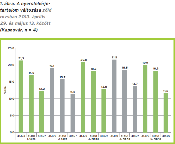 A gabonaszilázsok közül a szeptemberi vetésű és nagyon kora tavaszi (április) betakarítású, speciális fajtát vagy hibridet (vetőmagot) igénylő rozsszilázs kiváló eredményeket adott az elmúlt években. A növény potenciálisan 15–20 tonna/ha hozamra képes (szilázsra vetítve). A rozs azonban gyorsan ’öregszik’. A rozs ’öregedésével’ nemcsak nő a növény rosttartalma, de a lignifikáció révén megváltozik rostösszetétele is. A beépülő lignin miatt a sejtfal ellenállóbb lesz a külső hatásokkal szemben, ami csökkenti a táplálóanyagok emészthetőségét (sejtfalhatás), végső soron jelentős mértékben csökkenti a növény táplálóértékét (energiatartalmát). A tejtermelés szempontjából meghatározó jelentőségű, hogy milyen a tömegtakarmányok emészthetősége és energiatartalma. Nagyobb energiatartalmú tömegtakarmányt etetve csökkenthető az abrak részaránya az adagban, a bendőműködés számára kedvezőbb abrak-tömegtakarmány arány alakítható ki. Ennek hosszú távú kedvező hatását valamennyien ismerjük (hosszú hasznos élettartam, ellenálló képesség: javuló láb- és tőgyállapot, kedvezőbb szaporodásbiológiai státusz). A tömegtakarmány részarányának növelése ily módon csökkentheti a napi adag költségét is. Mérlegelni kell azonban azt is, hogy a betakarítandó tömegtakarmány önköltsége hogyan alakul a várható hozam függvényében. A táplálóanyagok közül az öregedési folyamatot jelző egyik legfontosabb táplálóanyag a nyersfehérje, továbbá a rost, ezen belül a lignin. Ehhez kívánunk adatainkkal segítséget nyújtani, bemutatjuk a zöld rozs fehérjetartalmának változását egy-egy hét eltolással történt betakarítás mellett (április 29., május 7. és május 13.) (1. ábra). Az eredmények alapján megállapítható, hogy a nyersfehérje-tartalom a két hét alatt közel a felére esett vissza. A lignintartalom majdnem megduplázódott, tehát a lignifikáció rövid időszakon belül rendkívül erőteljes volt. A változás mértéke azonban már 7 nap elteltével jelentősnek ítélhető! A nyersfehérje-tartalom átlagosan 7,7–9,1% sza. értékkel csökkent 14 nap alatt, ami 10 kg/nap/tehén rozsszilázs etetése esetében legalább 0,6 kg/nap/tehén extrahát szójadarával egyenértékű (500 tehén esetében 1 év alatt ez legalább 9 millió Ft többletköltséget jelent!).