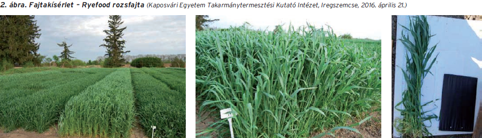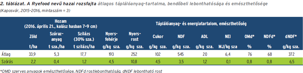 Bemutatunk egy új hazai rozsfajtát (2. táblázat), amelyet 2015 őszén vetettünk és 2016. április 21-én takarítottunk be a Kaposvári Egyetem Takarmánytermesztési Kutató Intézetében (a kalász hasban volt, mérete: 7–9 cm). A Ryefood fajtát kedvező hozam- és táplálóanyag-tartalom jellemezte.