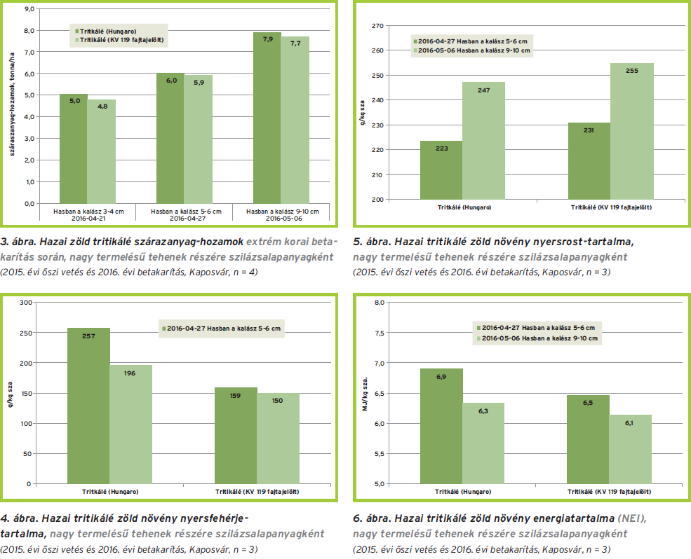 A Kaposvári Egyetem Takarmánytermesztési Kutató Intézetében (Iregszemcsén) 2015 őszén beállítottunk egy kísérletet, ahol a tritikálé öregedési modelljét vizsgáltuk (betakarítás: 2016. április 21., április 27. és május 6.). Mészlepedékes csernozjomon (mély termőrétegű vályogtalajon) végeztük a kísérletet. Az őszi alaptrágyázás október 5-én történt (300 kg/ha: NPK 8/20/30). A vetést október 12-én végeztük el. A tavaszi fejtrágyázást február 9-én hajtottuk végre (Pétisó: 300 kg/ha). A kísérlet részeredményei az 4–6. ábrán láthatóak. Úgy tűnik, hogy a két új, hazai fajta nem marad el a rozstól hozamban és táplálóértékben. Két héttel később takarítható be, ami potenciálisan melegebb időjárást jelent a fonnyasztás során, és kevésbé kritikus a kaszálás időpontjának csúszása a lassabb fejlődési ütem miatt. Kérdéses lehet azonban a munkacsúcs a lucerna és az intenzív termesztésű füvek betakarítása miatt, valamint a másodvetésű silókukorica tenyészideje szempontjából. A választás mérlegelés kérdése.