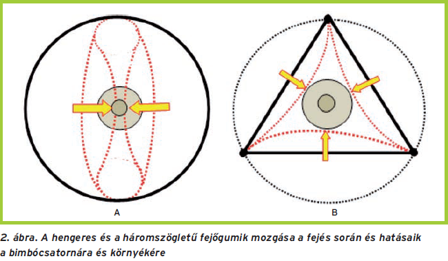 A mechanikus hatást nézve számolni kell azzal, hogy a fejés végére a bimbó megnyúlik. Az a cél, hogy a bimbócsatornát a gumi az összezáródásánál ne terhelje – nyomja meg – túlságosan. Ha erre nem figyelünk, a záróizomzat deformálódik és elveszíti rugalmasságát, nem tud megfelelően kinyílni, és ezzel kevesebb tej áramlik át rajta, nő a fejési idő. A túl rövid és a nagy átmérőjű gumik jellemzően ezt okozzák. Fogadjuk el fontos alapszabálynak, hogy a tehénállomány tőgybimbó-alakulásához az a fejőgumi felel meg, amely a felrakás után csak a bimbó kétharmad részét foglalja magába és a fejés végére sem kúszik fel a bimbók bázisára, „nem nyeli el az egész bimbót”. E hatás megszüntetése céljából használják a nem hengeres, hanem három- vagy négyszögletű gumikat. A szögletes gumik sokkal kisebb erővel terhelik a bimbócsatorna záróizomzatát (2. ábra B).