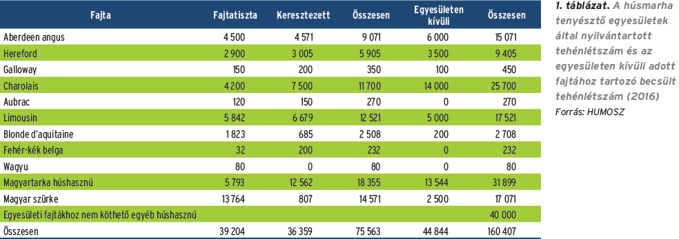 A táblázatból látjuk, hogy a 2016-os tényleges húshasznú tehénlétszám 160 ezer, az állomány zömét nálunk tenyésztett világfajták, illetve ezek keresztezett állománya adja. Ha megvizsgáljuk a törzskönyvi ellenőrzés alá vont állomány létszámát, mindösszesen 40 ezer egyed körüli. Szembetűnő, hogy hasonló nagyságrendű az egyesületeken kívüli különböző fajtákhoz besorolható állomány, amely, ha törzskönyvi ellenőrzés alatt állna, pár év alatt közel megduplázhatná a hazai húsmarha tenyészállatok kibocsátását. Ez magasabb hozzáadott értéket, több exportbevételt, a tenyésztők számára pedig több jövedelmet jelentene.