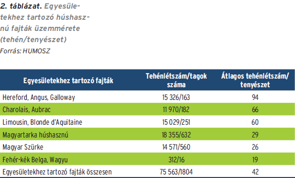 A táblázatból láthatjuk, hogy az egyesülethez tartozó fajták átlagos tehénlétszáma 42 tehén. Egyes fajták között jelentős különbségek vannak, míg a hereford és az angus közel 100-as, a fehér-kék belga 19, a magyartarka húshasznú 29, a charolais 66, a limousin 60 körüli átlagos tehénlétszámú. Természetesen az átlag tehénlétszám bizonyos mértékig megtévesztő lehet, mivel Magyarországon jelenleg a 10 alattitól a 2000-es tehénlétszámig fordul elő az üzemméret, azonban az átlag a helyzetet mégis jól jellemzi. Ha versenyképesség szempontjából vizsgáljuk, akkor a húsmarhatartás anyatehéntartási szakasza tipikusan olyan tevékenység, ahol a különböző méretek is versenyképesek lehetnek, mivel a marginális hatékonyságot más-más szűk keresztmetszetek befolyásolják. Az őstermelőtől a családi gazdálkodón keresztül, a társas vállalkozásokon át a nagybirtokig szinte minden üzemméret lehet hatékony és versenyképes (természetesen függően az alkalmazott termeléstechnológiától, illetve az annak következményeként adott termelési rendszerben lévő állandó költségektől). A marhahízlalásra vonatkozóan sokszor elmondjuk és leírtuk, hogy Magyarországon szinte alig található versenyképes, megfelelő hatékonysággal működő, komoly árukibocsátást biztosító hízómarha telep (5000 hízómarha/év feletti). Az ehhez szükséges integrációknak csak nagyon kevés helyen látjuk csíráját, ez részben következménye a mezőgazdaságot érintő, esetenként elhibázott gazdaságpolitikának.