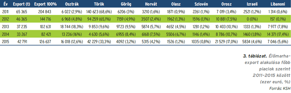 Látható, hogy az élőmarha-kivitelünk többszereplőssé vált. Az Európai Unió 28 tagállamából három ország kivételével a többi vásárlónk volt. A harmadik országbeli piacok közül az orosz, a török, a libanoni piacon kívül szállítottunk még Ázsiába, a Közel-Keletre, kisebb mennyiséget Észak-Afrikába, Egyiptomba, míg a piacok közül a görög, horvát, olasz, szlovén, osztrák, orosz, izraeli, libanoni közel másfél évtizedes múltra nyúlik vissza. Mind az árak, mind a volumen növelésében fontos szerepet játszó török piac 2011-ben jelent meg először. Azóta hullámvölgyekkel ugyan, de fontos meghatározója a magyar élőmarha-kivitelnek. Nagy figyelmet érdemelnek az orosz piac és a volt Szovjetunió utódállamai, amelyek elsősorban a tenyészállat-kivitelben játszanak szerepet, ezt a területet szerencsére nem érintik az európai uniós szankciók.