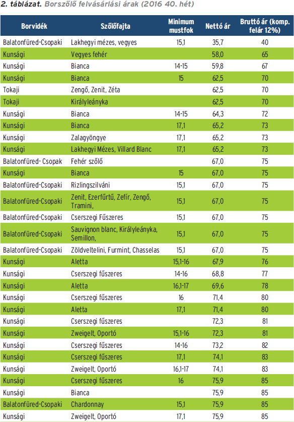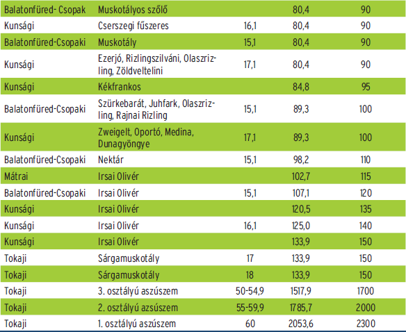 A szőlőárakkal kapcsolatban az FM-től megtudtuk, hogy az árak meghirdetésével foglalkozó nagy cégek gyakorlatilag befejezték a felvásárlást. A szüret ezzel párhuzamosan a vége felé közeledik, már csak azok a szőlők maradnak kint, amelyeket kifejezetten késői szüretelés céljából tartanak még a termelők. A szőlőárak bizonyos fajták esetében jelentősen visszaestek, ugyanakkor a szüretelt mennyiség némileg kompenzálni tudta a termelőket. A mellékelt táblázatból jól látszik, hogy az illatos szőlőfajták szinte a teljes szüreti időszak alatt tartották az átlagnál magasabb felvásárlási árakat.