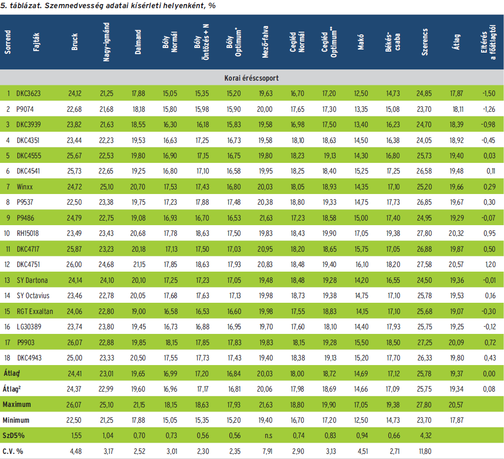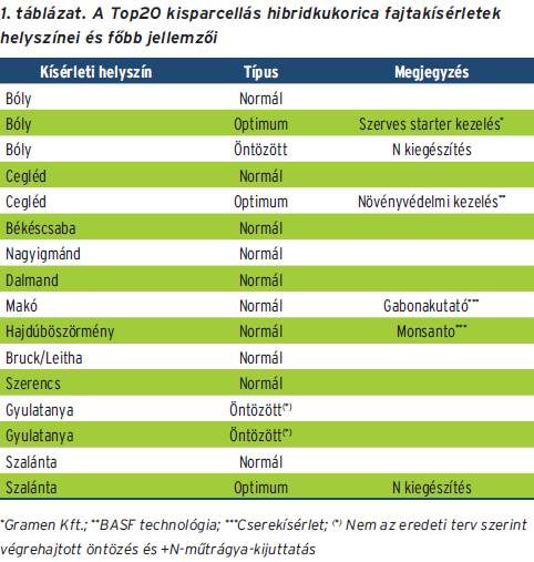 A bemutatott terméseredmények a Magyar Kukorica Klub (MKK) TOP20 Kisparcellás Összehasonlító Fajtakísérletek 16 kísérleti helyen elvetett, kisparcellás, négyismétléses, véletlen elrendezésű kísérletéből származnak.