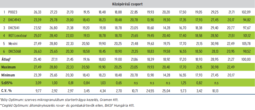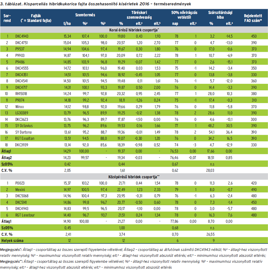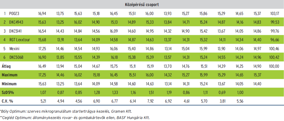 A kísérleteket az eredeti tervtől és a korábbi szokásoktól eltérően az értékeléskor a tervezett csoportsztenderdeket nem vettük figyelembe. A csoportsztenderdet így a csoportátlag képviseli. A DKC4943-at meghagytuk az átfutó sztenderd szerepben, s a csoportátlagot a korai csoportban két számmal jellemeztük. Itt nem részletezett okokból elhagytuk a tenyészidőt jellemző FAO-szám hazai módszer szerinti újraszámolását. Úgy gondoltuk, hogy ezekkel az intézkedésekkel kísérleteink jobban harmonizálnak a rendszerváltás után kialakult szabadabb vetőmagpiaccal.