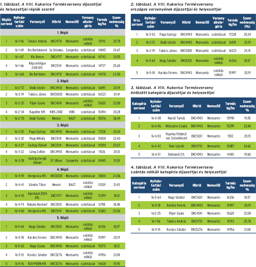 a Magyar Kukorica Klub VIII. Kukorica Termésversenyének helyezettjei és díjazottjai. A kései éréscsoport tartalmi értékelése még folyik, azt a későbbiekben közöljük lapunkban.
