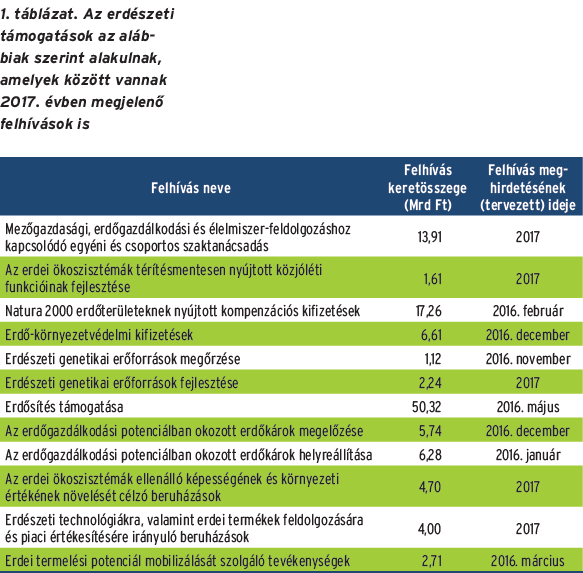 – A Vidékfejlesztési Program 2014–2020 teljes összege 1 296,17 milliárd forint, amely 70 pályázati felhívásban lesz elérhető. Ebből 12 az erdészeti intézkedés, amelyre összesen 104,35 milliárd forint jut. Tavaly 6 erdészeti jogcím jelent meg, összesen 79,45 milliárd forint értékben. Kihirdetés előtt áll újabb 6 erdészeti jogcím, összesen 24,9 milliárd forint összeggel. Az elmúlt évben lezárult „Az erdőgazdálkodási potenciálban okozott erdőkárok helyreállítása” pályázat (6,28 milliárd forintra 207 kérelem érkezett), a „Natura 2000 erdőterületeknek nyújtott kompenzációs kifizetések” jogcím (17,26 milliárd forint, a beérkezett kérelem 3196 darab), az „Erdei termelési potenciál mobilizálását szolgáló tevékenységek” pályázat (2,71 milliárd forintra 1175 kérelem érkezett). Nyitott még az erdősítés támogatása pályázat, amelyre kiemelten magas összeg áll rendelkezésre (50,32 milliárd forint), s az erdészeti genetikai erőforrások megőrzése felhívás (1,12 milliárd forint). Az erdősítés támogatása talán a legfontosabb intézkedés, mert a kitűzött 27 százalékos fával való borítottság eléréséhez az egyetlen támogatási lehetőség. A pályázati felhívás megjelenése óta több mint 2600 hektár területre érkezett be támogatási kérelem. Ugyanez a jogcím az ipari célú faültetvények létesítésének is nyújt támogatást, amellyel az a cél, hogy a fa, mint megújuló alapanyag nagyobb arányban jelenjen meg a hazai piacon. A legújabb hír, hogy megjelent a VP4-15.1.1-16 azonosító számú Erdő-környezetvédelmi kifizetések elnevezésű felhívás, amely az alábbi linken érhető el: www.palyazat.gov.hu/megjelent-az-erd-krnyezetvdelmi-kifizetsek-cm-felhvs. Nagyon reméljük, hogy minél több gazda fog fát ültetni, erdősíteni a megnövelt egységáraknak következtében, ezzel is hozzájárulva a környezeti állapotunk javításához.