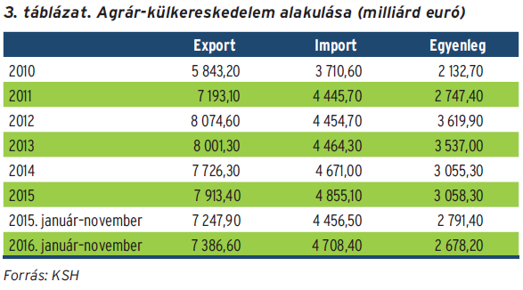 – Köszönöm a kérdést, mert így elmondhatom, hogy 2012 óta az agrárexportunk 8 milliárd euró körül alakul, az import 4,5–4,9 milliárd euró között mozog. A kettő különbözete az aktívum, ami nagyon jelentős. Az elmúlt évi 1–11. havi adatok alapján azt mondhatom, hogy minden esélyünk megvan ahhoz, hogy a 2015-ös esztendő teljesítményét túlszárnyaljuk, s a több mint 8 milliárd euró (és a több mint 3 milliárd eurós aktívum) is várhatóan meglesz. Érdekességként említem, hogy míg a nemzetgazdaság külkereskedelmi forgalmán belül az exportból 9 százalékkal veszi ki a részét az agrárgazdaság, az importból pedig 6 százalékkal, addig az aktívumnak csaknem 30 százalékát az agrárgazdaság teljesíti. Ez óriási eredmény. Friss élményként hadd mondjam el, hogy legutóbb a Grüne Woche kiállításon mutattuk meg magunkat, és díszvendégként nagyon sok figyelmet kaptunk. A háttérben igen sok tárgyalást folytattunk le, csak Fazekas Sándor miniszter úr húsz ország felső vezetőjével tárgyalt. Nagy István államtitkár úr és jómagam is több tárgyalást vezettünk, én zömmel német vezetőkkel, akikkel egyébként a 2020 utáni KAP-reformról is sikerült szót váltanunk.