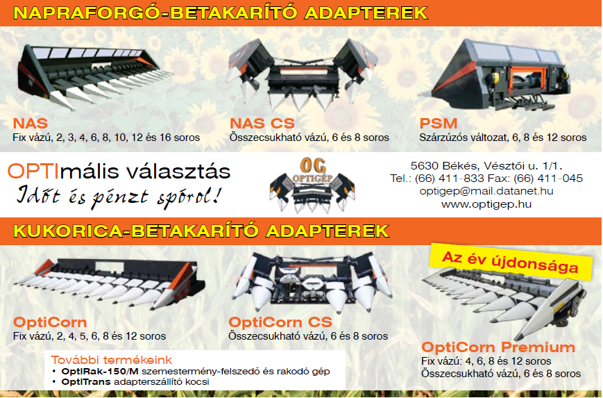 Az új OptiCorn Premium kukorica-betakarító adapter, amelynek egyedülálló, alumínium hajtóműházas hajtásrendszere hosszú fejlesztőmunka eredménye, amit a GKN-Walterscheid GmbH-val végzett az Optigép Kft. Az adapteren mindent hajtóművek hajtanak meg, így karbantartásmentes üzemeltetést biztosítva. Egyedi megoldás az adapter sebességváltó hajtóműve: egy kar segítségével az adott állománytól függően változtatható a gyári alapértékhez képest +/–5%-kal a fordulatszám. Hajtóművel meghajtott a terelőcsiga, ill. a törőegységek hajtását is Walterscheid biztonsági kapcsolók és kardánok biztosítják, ami a flexibilitást növeli. Ennek az adaptercsaládnak nagy újdonsága, hogy csak rozsdamentes acél, illetve alumínium felhasználásával készül a vázszerkezetük, ill. az alkatrészeik 90%-a, amivel jelentős, 20%-os súlycsökkenés érhető el egy hagyományos, acélvázas felépítésű adapterhez képest. Az anyaghasználat előnyei a kedvezőbb üzemanyag-felhasználásban, a taposási kár csökkenésében, valamint a hosszabb várható élettartamban is jelentkeznek, illetve a vízállásos területek betakaríthatóságában van jelentős előnyük.